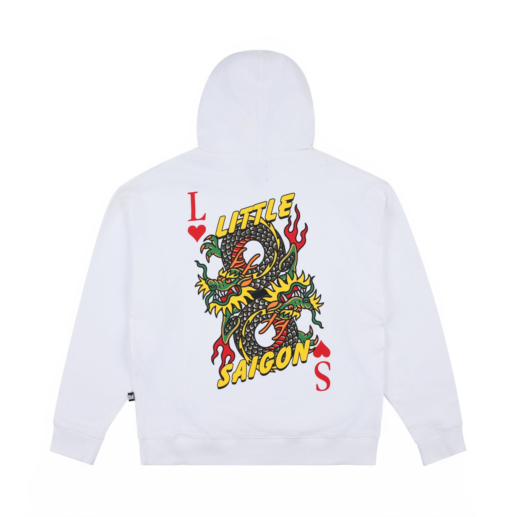 Striking a fusion of streetwear and cultural history, this crisp white hoodie features a bold and intricate dragon styled in the format of a playing card. The design showcases the dragon's dynamic form, symbolizing power and prosperity, framed with the traditional playing card motif.